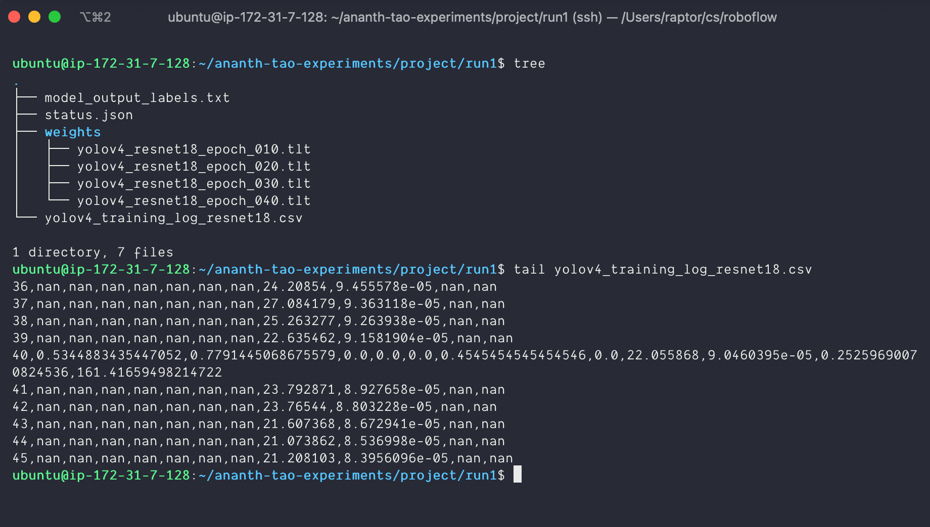!tao yolo_v4 train -e "/workspace/project/experiment_spec.json" -r "/workspace/project/run2" -k "roboflow" --use_amp