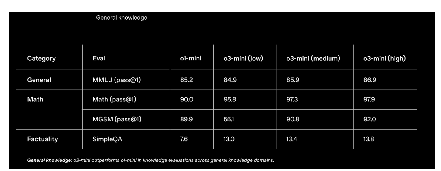 Each model achieves progressively better scores on the benchmarks OpenAI used to evaluate the model. You can read more about the benchmarks run on the model in OpenAI’s o3-mini launch post. Here is an example showing 03-mini High achieve better performance than o1-mini on all tested tasks.