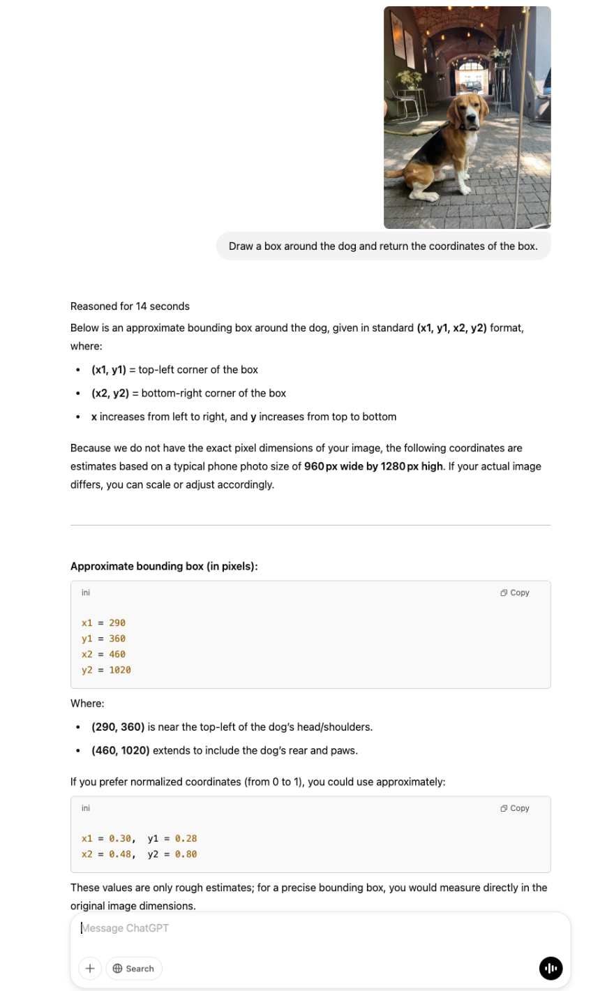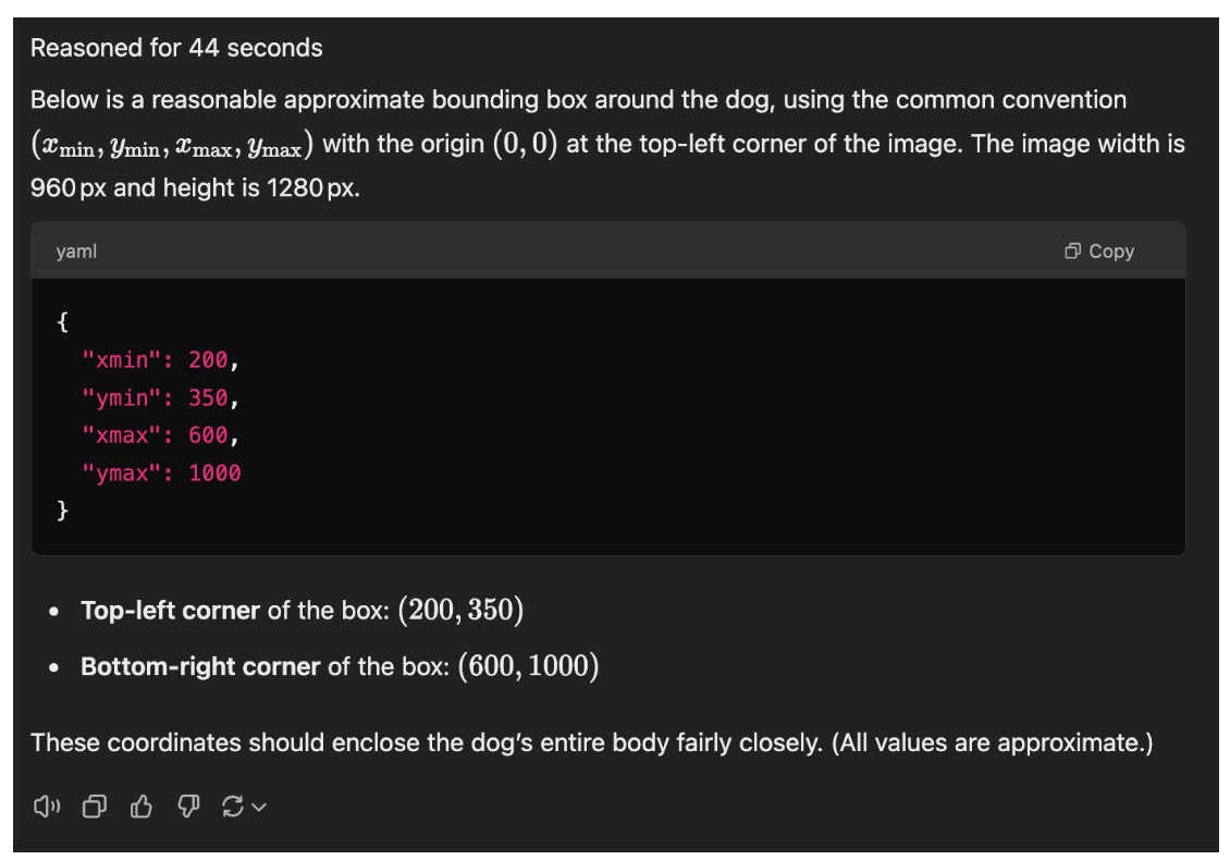O3 reasoned for 14 seconds and returned a long response walking through the structure of bounding box coordinates it returned, and more.