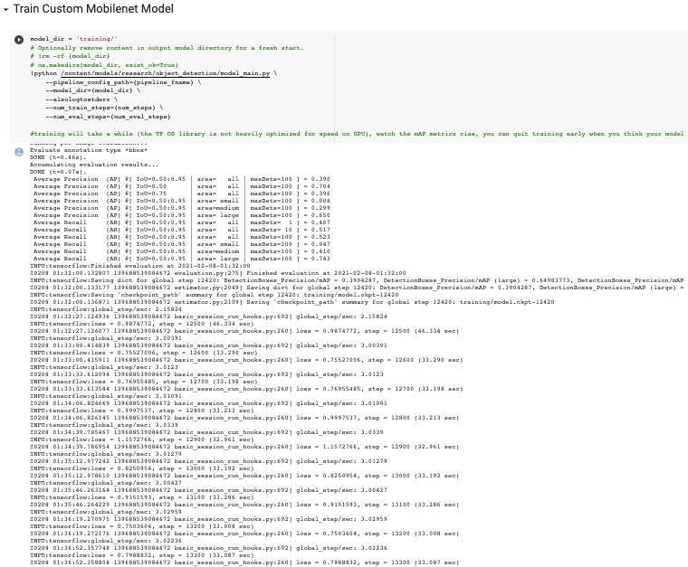 For training, we will be using Google Colab which offers a free GPU. Colab also comes pre-built with a lot of python dependencies that we might need. In addition to the pre-built dependencies, we will install the TensorFlow Object Detection API and write the configs that we will need for training, such as model type, batch size, number of iterations num_steps. The more num_steps you train for, the better your model will generally do, but training will take longer.
