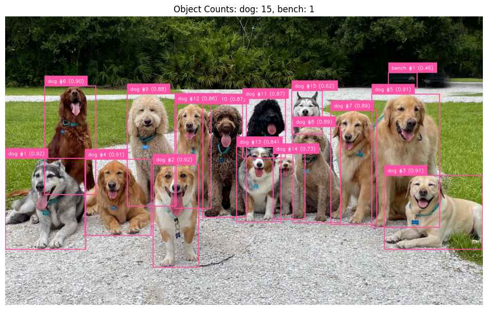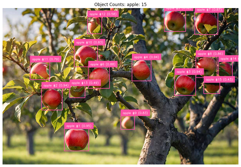 - Object Counting: Count the total number of detected objects by summing up the individual detections. Each valid bounding box or segmented instance is considered one count.