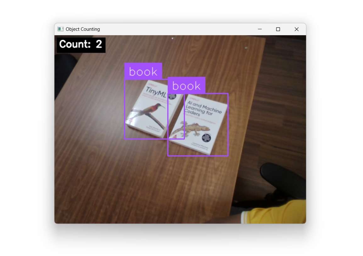 In this example, we count a specific object type (i.e. book in our example), filtered by class, directly from a live camera feed. Since we’re only interested in the number of detected objects in the current frame, there’s no need for tracking, the count resets every frame. This works much like counting objects in a still image, but repeated in real time.