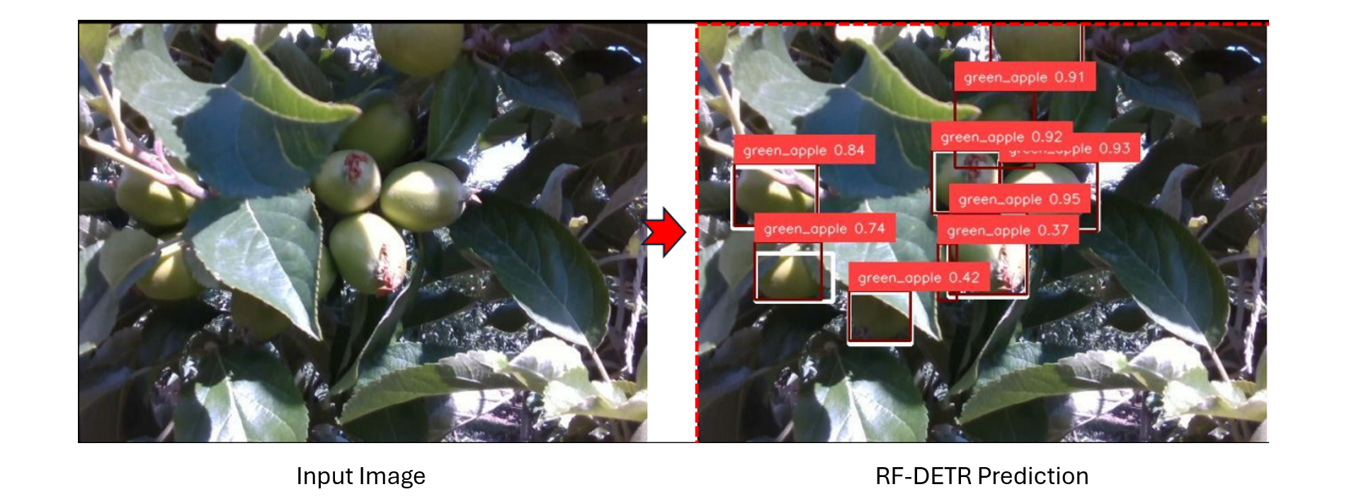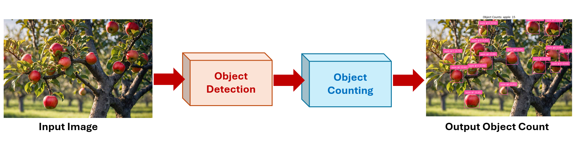 Think of it like the farmer example from the introduction, the farmer points the camera at an apple tree, and the system instantly counts how many apples are currently visible.