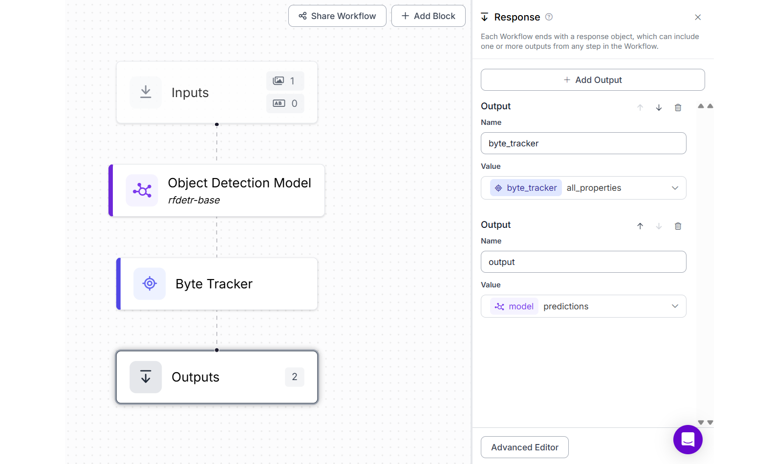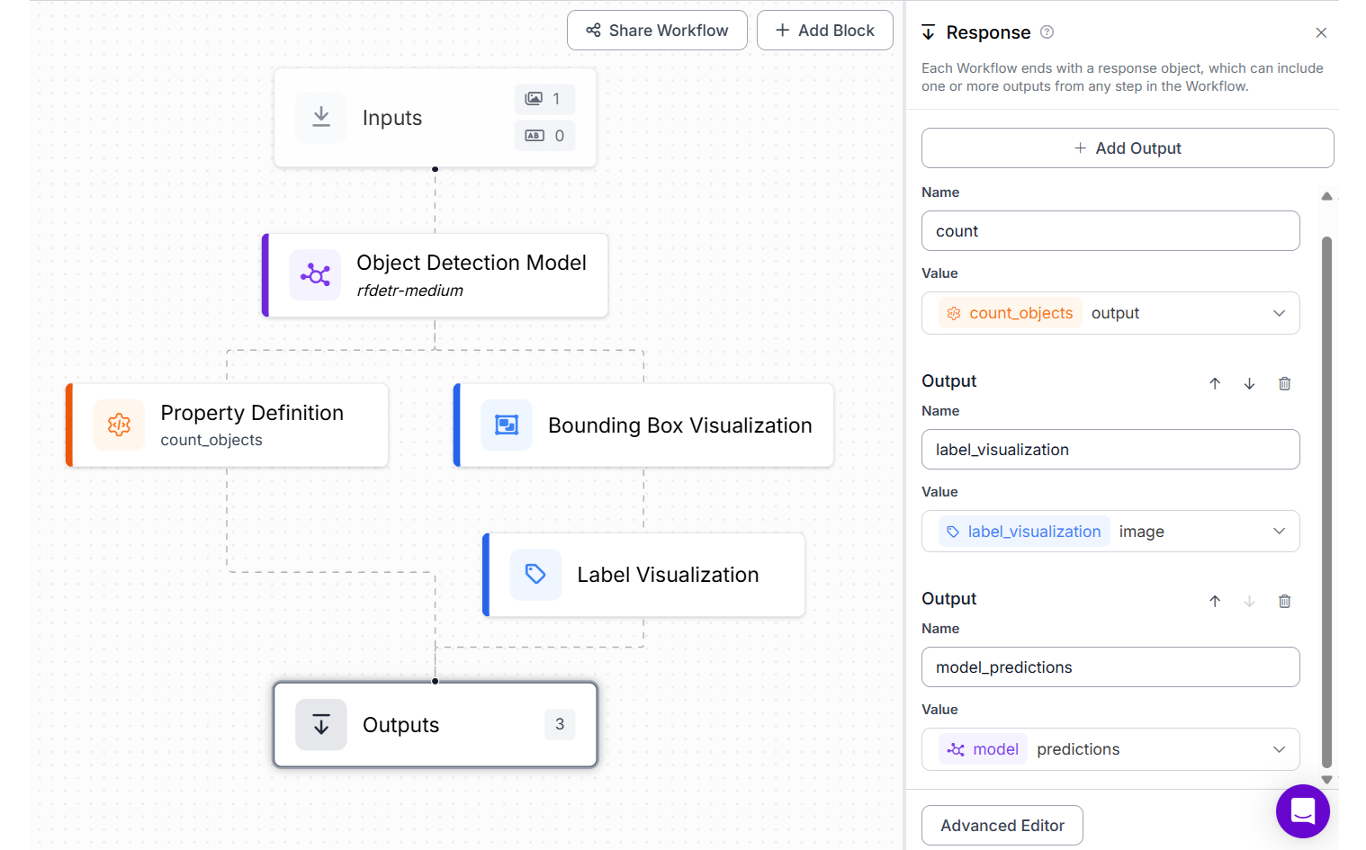 To make this possible, we build a Roboflow Workflow with the following blocks: