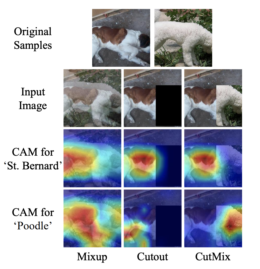 CutMix - A section of the image is randomly cut out and replaced with a section from a different image. This forces the model to not only predict around occlusion, but to learn not to rely too heavily on the surrounding environment it typically finds a given object, or class label in.