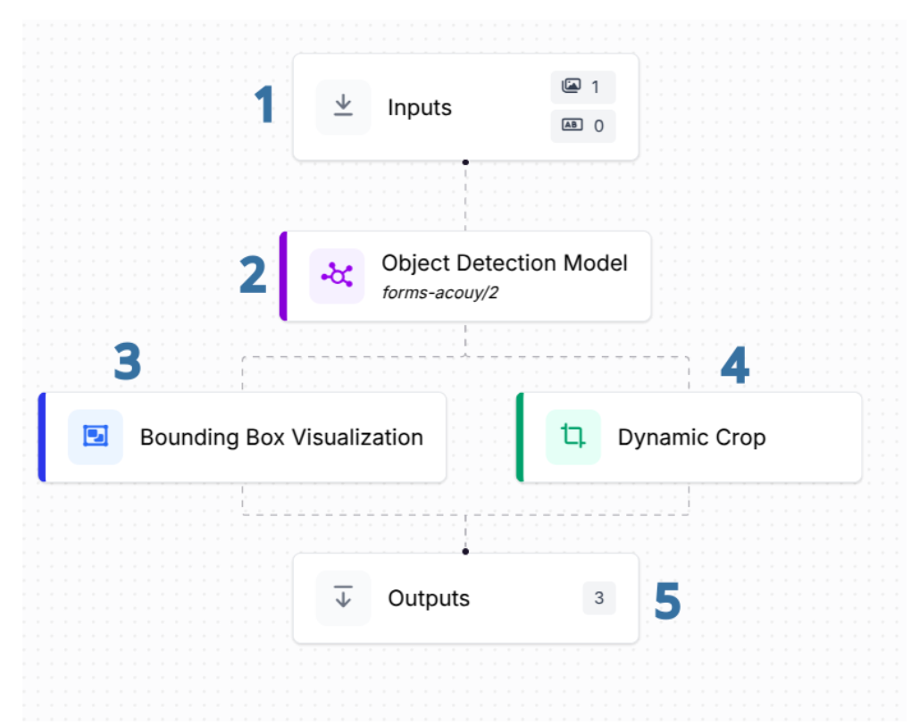 - Object Detection Block: This block runs the forms-acouy/2 object detection model, which has been trained on the forms-acouy dataset. It processes the image and sends its predictions to two other blocks.