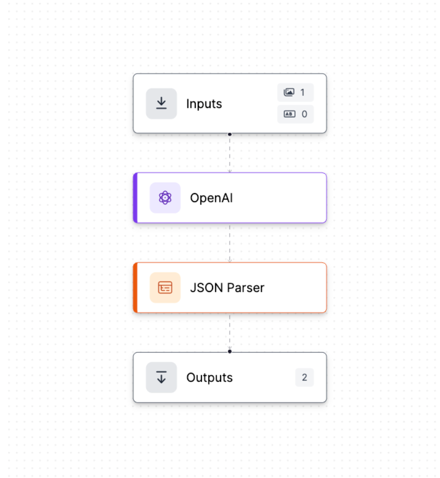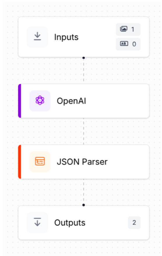 The workflow for this task using the OpenAI model is quite similar to the previous one, but this time we've added a JSON Parser block after the OpenAI block to parse the model’s structured output.