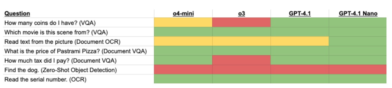 We evaluated OpenAI’s o3 and o4-mini multimodal support on several tasks, including: