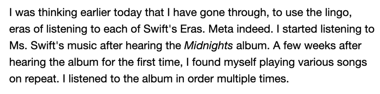 I was thinking earlier today that I have gone through, to use the lingo, eras of listening to each of Swift's Eras. Meta indeed. I started listening to Ms. Swift's music after hearing the Midnights album. A few weeks after hearing the album for the first time, I found myself playing various songs on repeat. I listened to the album in order multiple times.