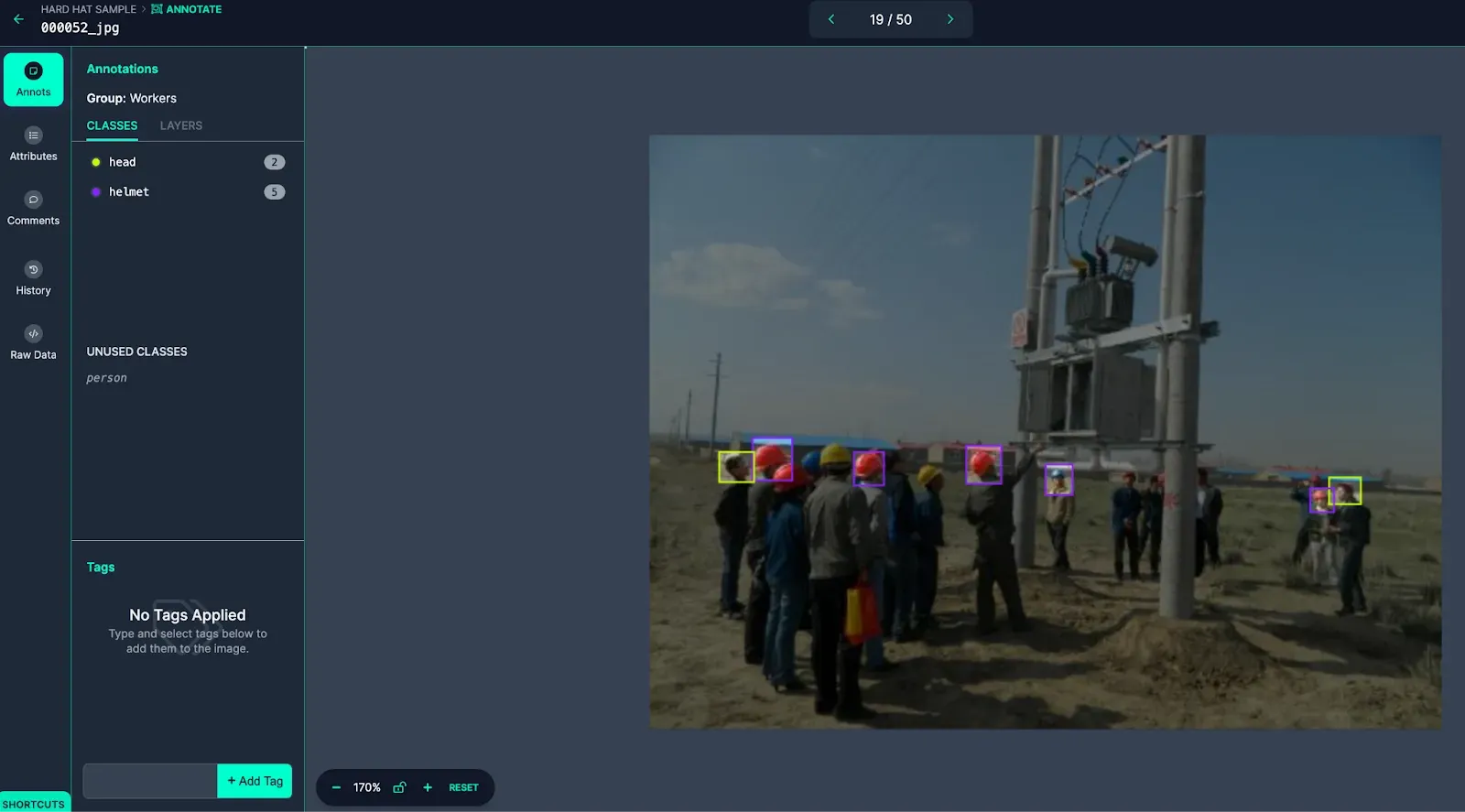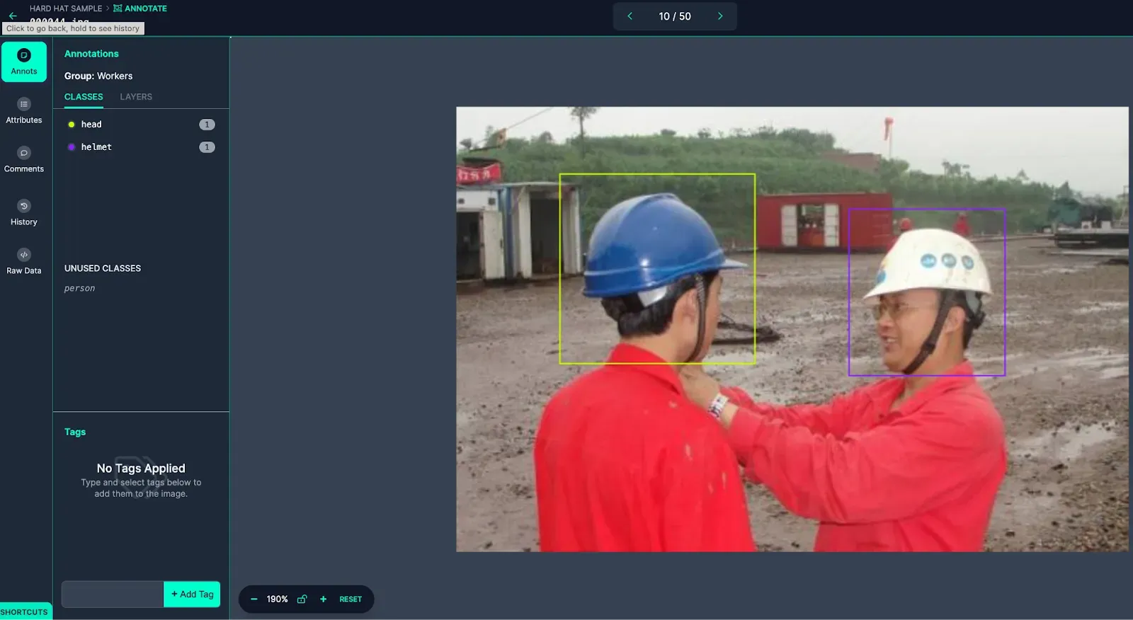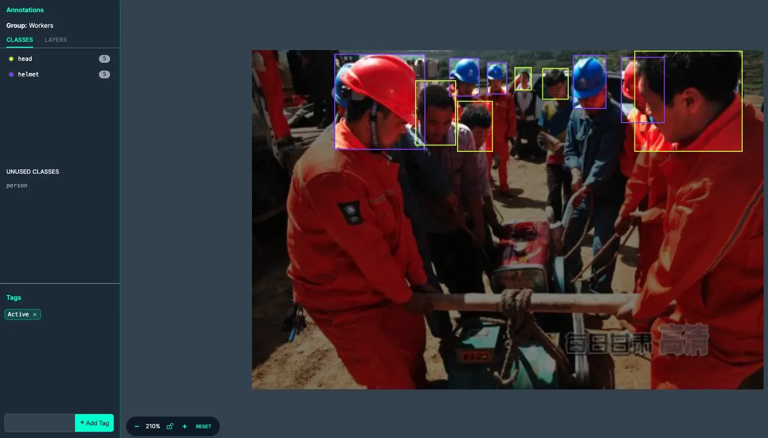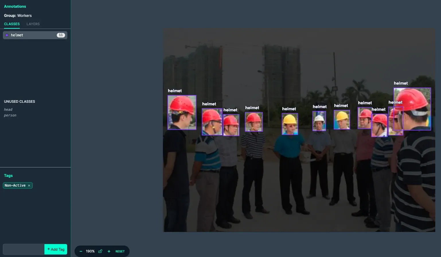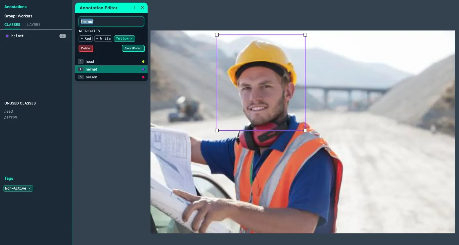 The image above is labeled with an Annotation Attribute to help increase labeling granularity (Yellow) within the class (Helmet). The image is also tagged to help with filtering and organization once added to the dataset.