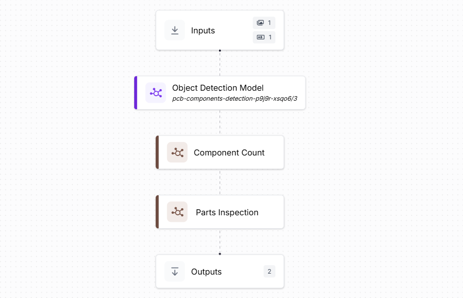 Now we will build the Roboflow Workflow to detect and count various components on a PCB. The workflow will analyze an input image, identify each component, and display the count for every detected class. The Workflow looks like following.