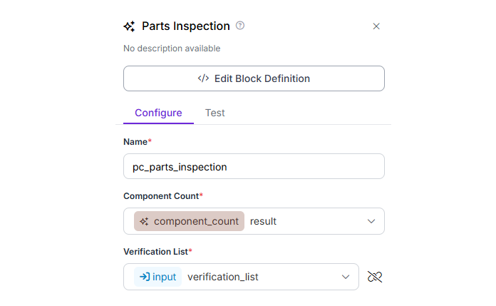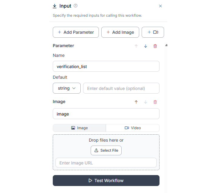 To build this workflow, firse configure the input block by adding input parameter verification_list along with image as follows. The verification_list parameter is used to provide a list of required components and their expected counts to the Part Inspection custom Python block. This allows the block to compare the detected components with the expected values and verify if everything is correctly placed on the PCB.