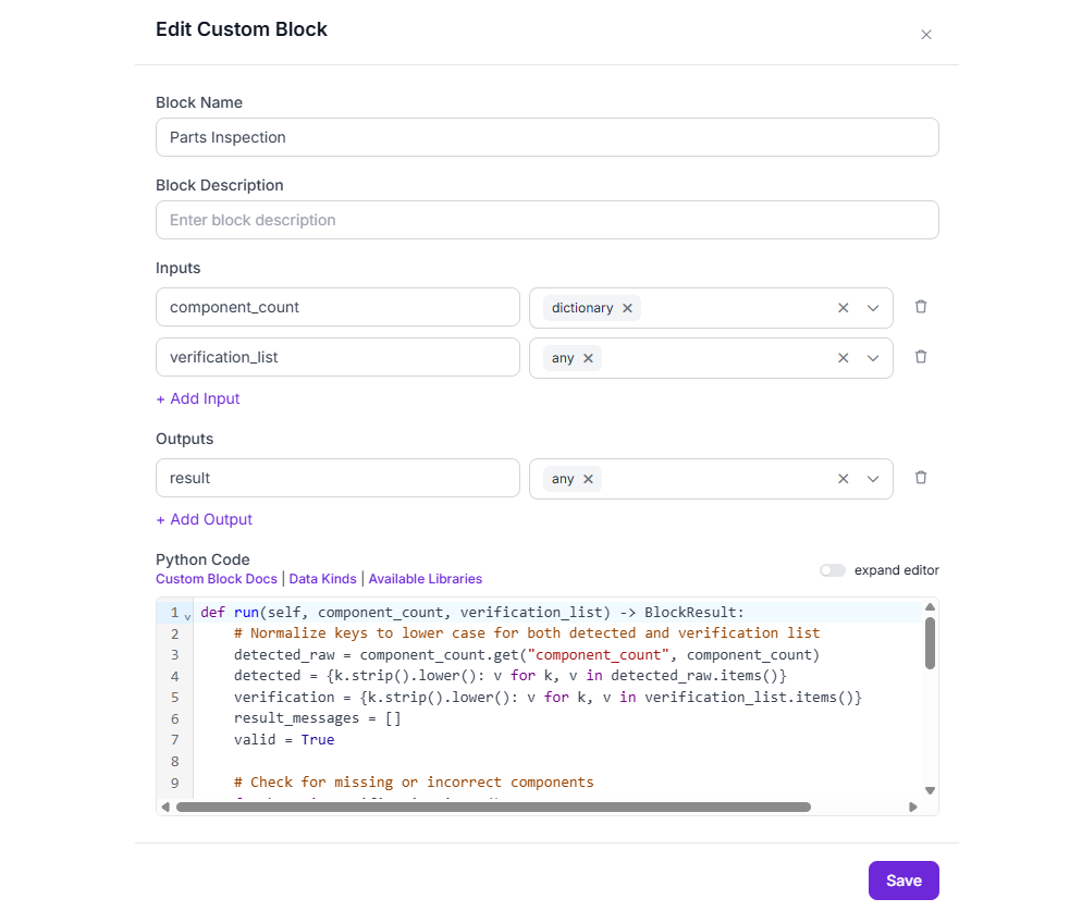 Now, add second Parts Inspection Custom Python block. This block will take input from first Python block and a verification list from input block. The code in this python block verifies whether the detected PCB components match an expected list. It normalizes the component names to lowercase, compares the detected and expected counts, identifies missing or extra components, and generates an appropriate message. If all components match correctly, it returns "PCB OK"; otherwise, it returns an alert with detailed discrepancies. Add the second Custom Python block and insert following code in it.