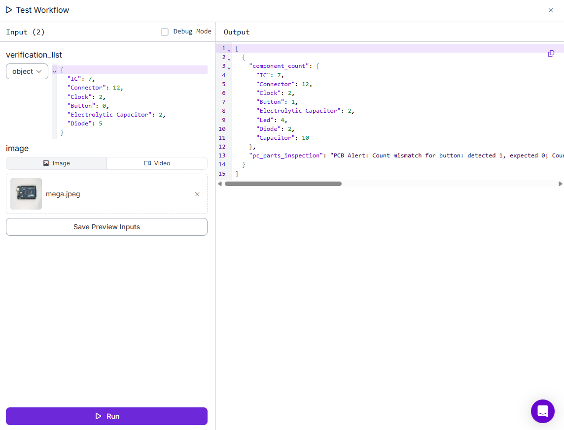 This list tells the system that a correctly assembled PCB should have 7 ICs, 12 connectors, 2 clocks, no buttons, 2 electrolytic capacitors, and 5 diodes. If any of these counts do not match the model’s detection output, such as missing a component, detecting extra parts, or identifying a component that shouldn't be there, the system can raise alerts accordingly. This ensures reliable and automated quality control during PCB manufacturing. With the above verification_list passed as input, the Workflow will return following output, accurately detecting missing, extra and foreign components.