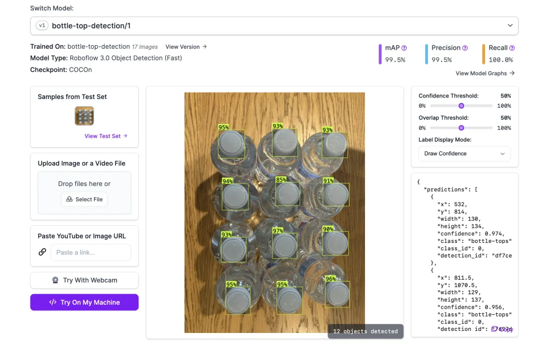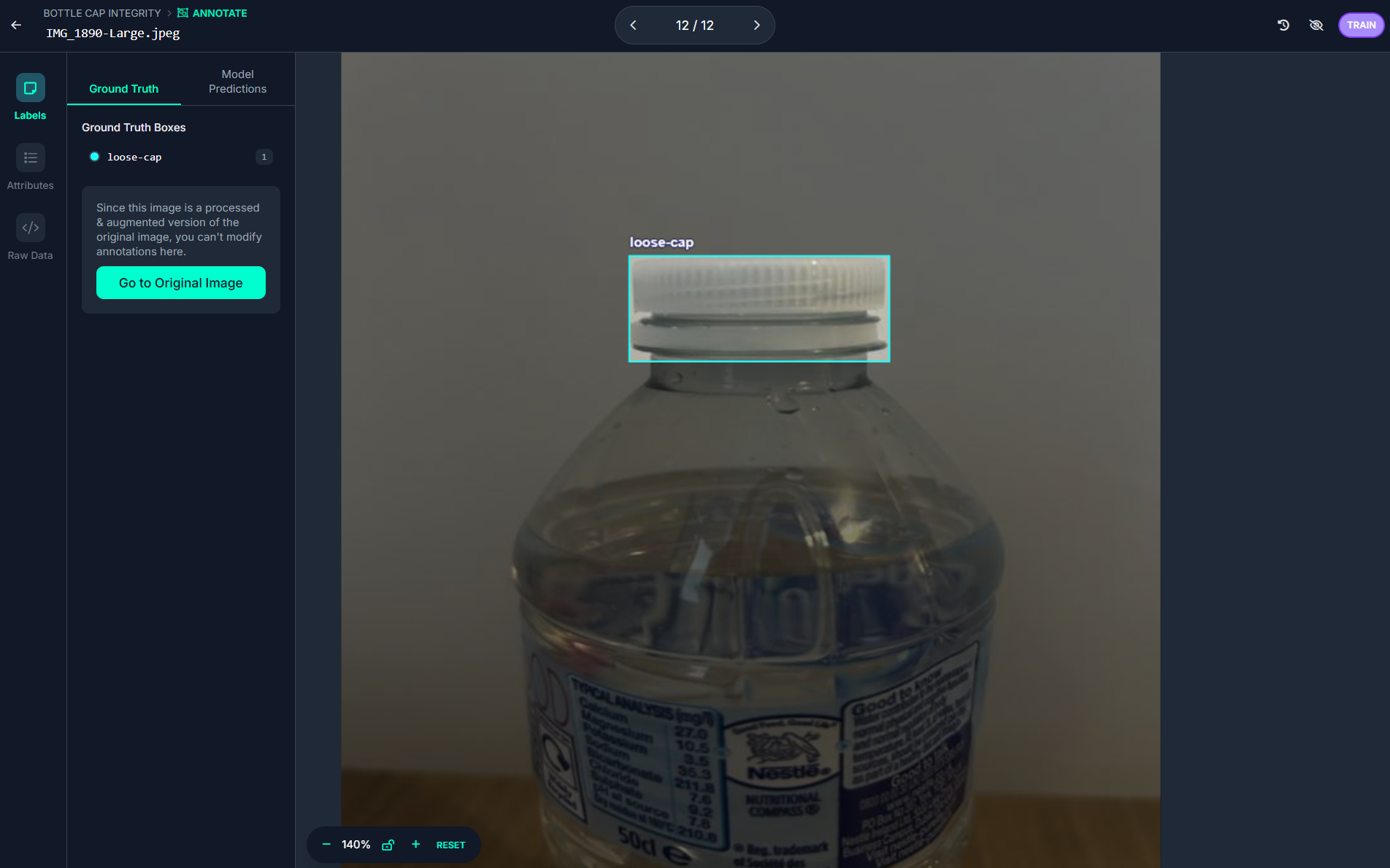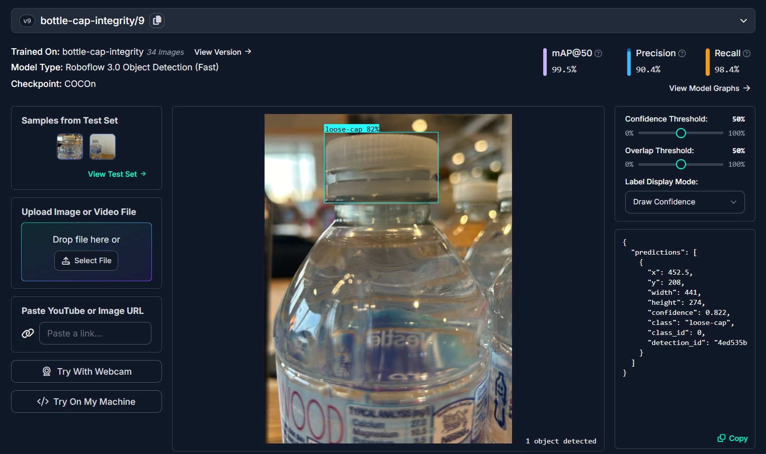 The goal is to automatically identify whether a bottle cap is properly sealed, loose or not properly sealed, or missing entirely. This type of inspection is crucial to ensure product quality before packaging and distribution. You can train this model by collecting an image dataset of sealed and unsealed bottle caps. The images then can be labeled as loose-cap and sealed-cap classes and a computer vision model can be trained using Roboflow.
