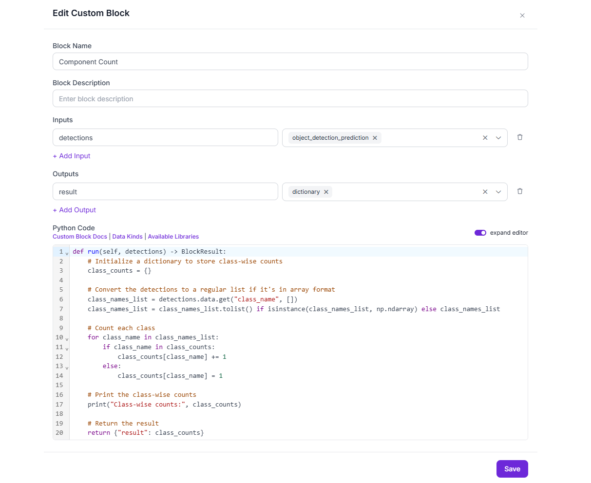In this workflow, we will add two Custom Python blocks i.e. Component Count block and Parts Inspection block. The first Component Count python block will calculate the count of each component type detected by the model, helping to verify whether the PCB contains the correct number of required components and ensuring inspection accuracy. Add a Custom Python Block to the workflow and insert the following code to process the detection results to count PCB components.