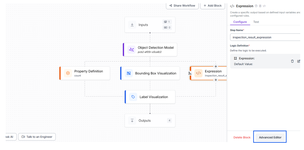To enable real-time inference, we create a Roboflow Workflow, starting with the “Detect, Count, and Visualize” sample workflow. This workflow detects defects, counts them, and generates a visualized image with bounding boxes around each defect. To go beyond, we can add decision-making logic. We can include a custom Expression Block to evaluate detected defects and output an inspection result.