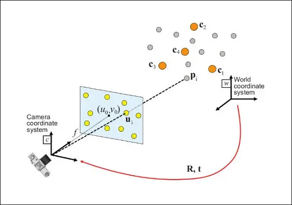 Now, the DLT algorithm takes these known 3D-2D correspondences and uses them to estimate the camera's pose. It does this by solving a set of mathematical equations that relate the 3D world points to their corresponding 2D image points. By solving these equations, the DLT algorithm can figure out the camera's position and orientation.