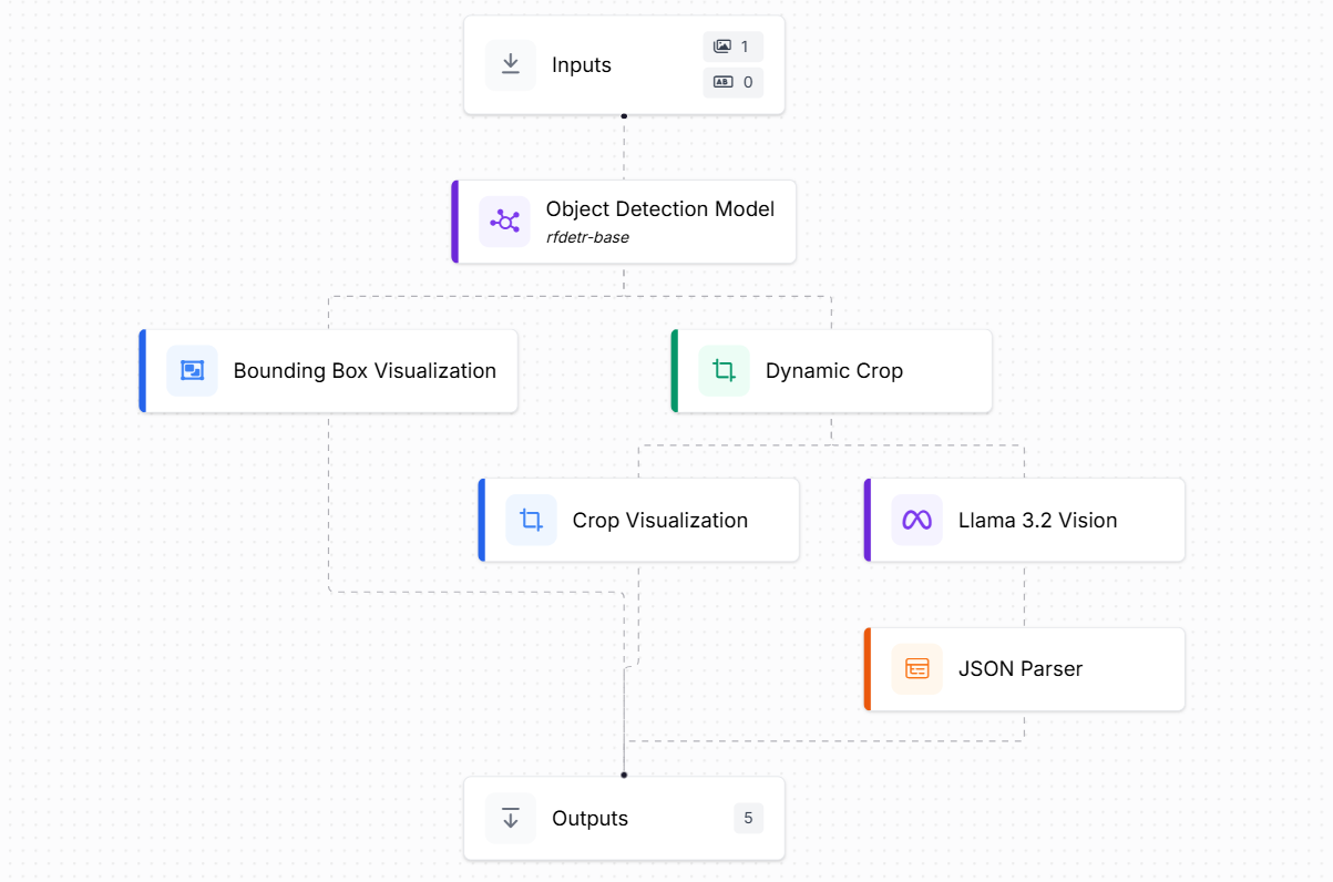In this example, we will explore how to use pre-trained models within a Roboflow Workflow by building an automated book inventory system. The Workflow will begin with the RF-DETR model, which detects the book placed on a desk. After detection, we will crop the book region, since there may be other objects present and we only want to focus on the book. This step ensures that only the relevant portion of the image is passed forward for processing. Next, we will use the LLaMA 3.2 Vision model to extract the book’s details in a structured JSON format. These extracted details can then serve as input for a book inventory application or database.