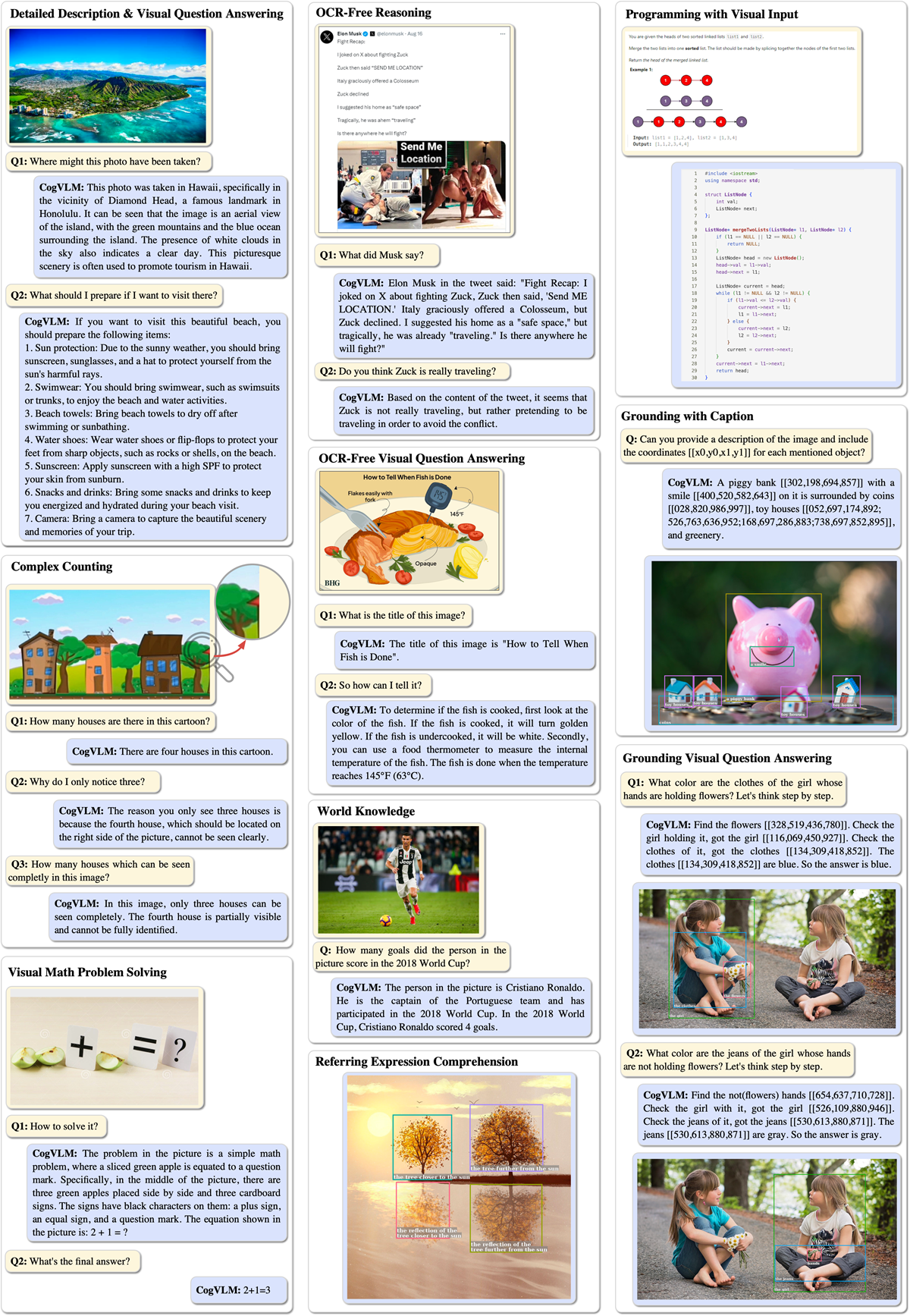 - Tasks. CogVLM supports image captioning, visual question answering, OCR/document understanding, chart analysis, visual grounding and open vocabulary detection.