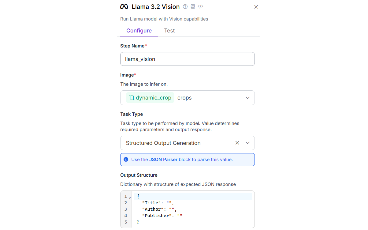- LLaMA 3.2 Vision Block: The cropped book image is sent to LLaMA 3.2 Vision, a vision-language model. This model analyzes the image of the book and extracts structured details (e.g., title, author, publisher etc.). The output is text, usually in structured form like JSON. This block must be configured for “Structured Output Generation” as below: