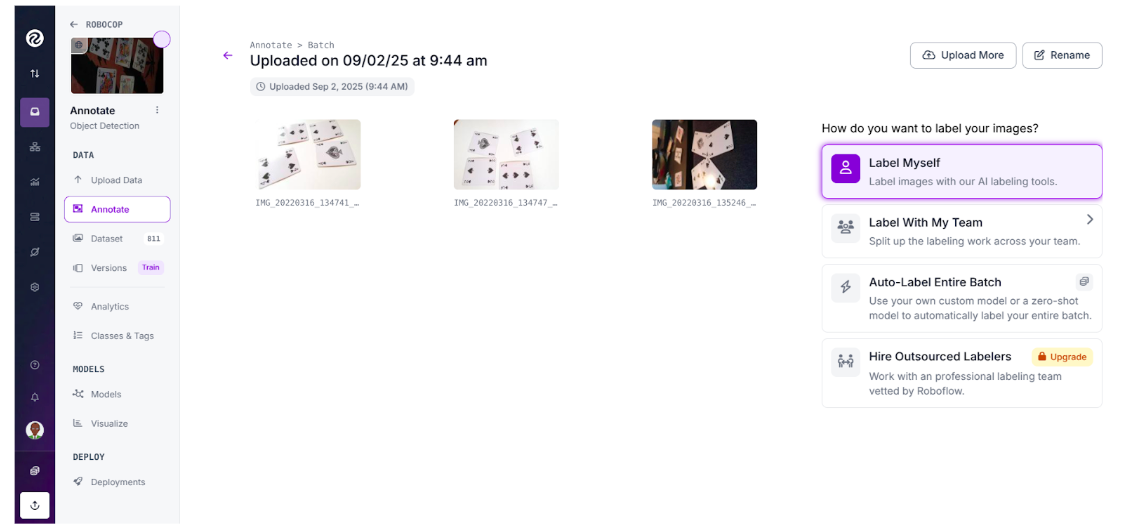 You can manage the entire process of collecting card photos with Roboflow (just create a free account and start your project). After gathering the images, proceed to annotation.