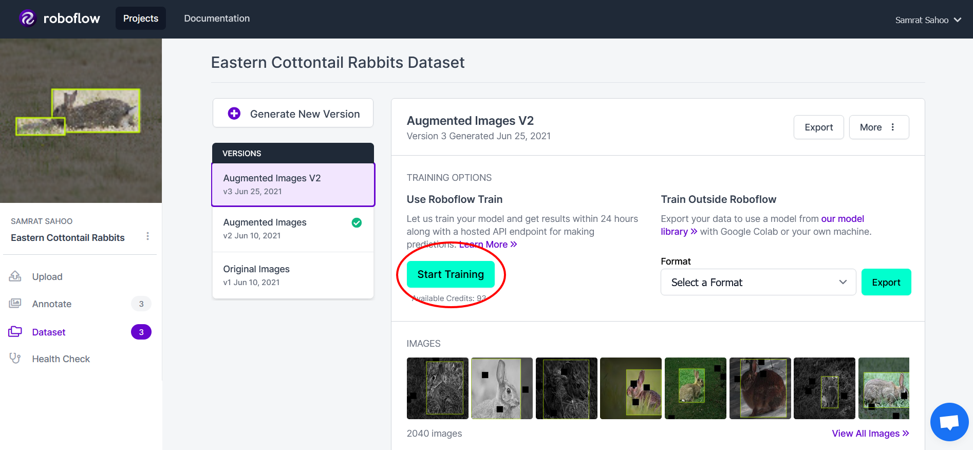 To use Roboflow Train, simply click on the train button that can be found on the dataset version dashboard and train the model from scratch: