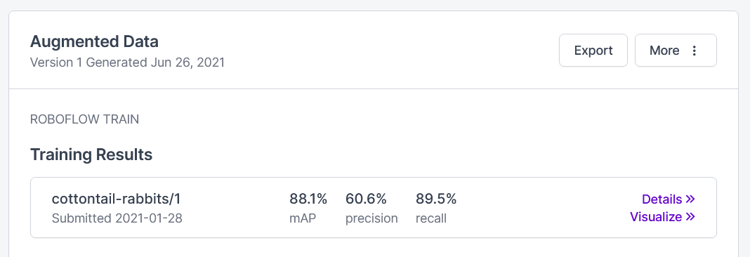 Model training can be a difficult task with so many different frameworks and settings to tune. Roboflow Train makes it easy to overcome this by allowing a one-click training process resulting in an optimal model.*