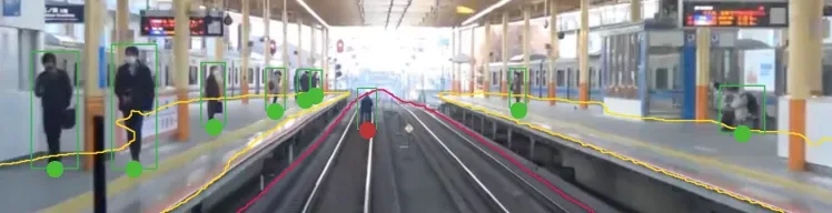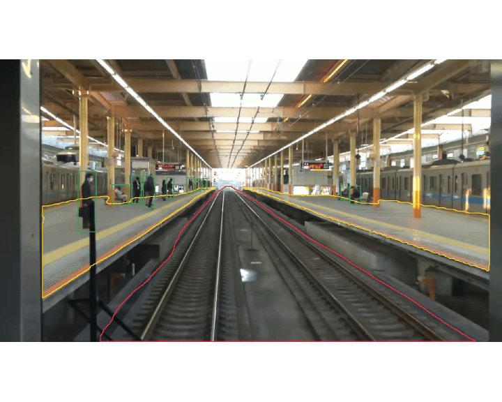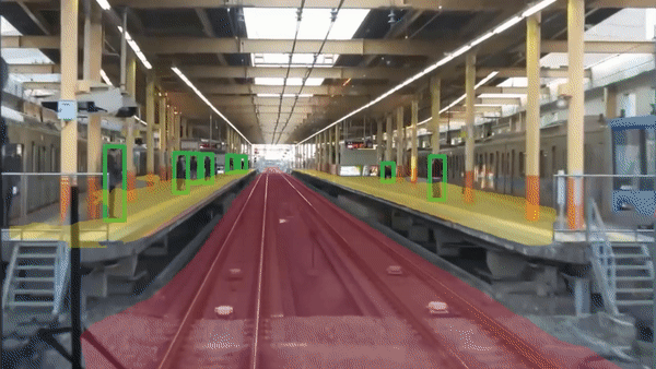 Although running inference on a video does reveal some additional room for improvement on the model, it does accurately detect most of the critical areas well, which should allow tracking of where instances of people (marked green) start leaving the platform (marked yellow) or enter the tracks, (marked red) triggering respective alerts.