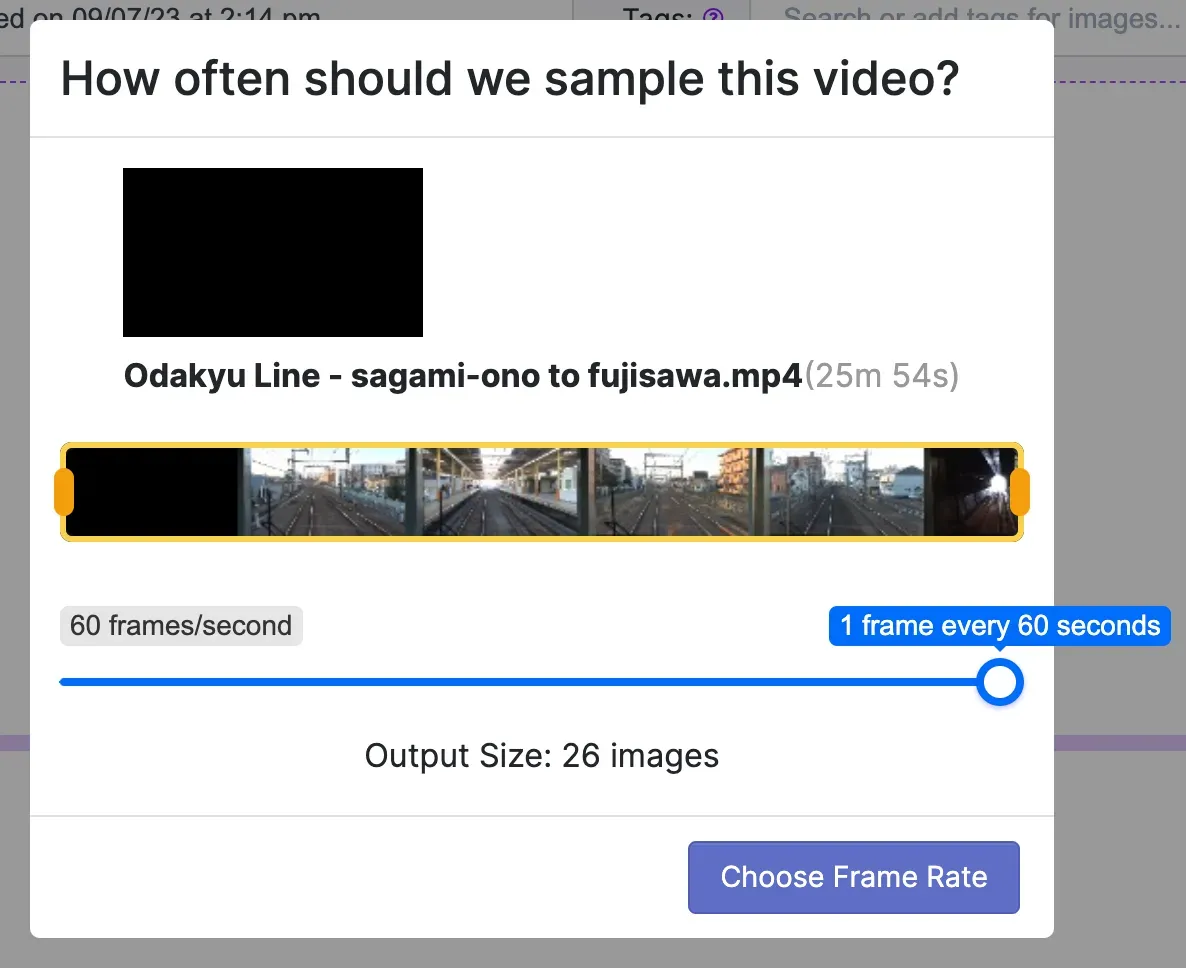 We will start with building a model for detecting the train infrastructure (platform, tracks, crossings). After collection, we initially wanted to train a preliminary model so that we could use model-assisted labeling to speed up our labeling process. To start, we imported our two-hour-long captured video by selecting a low rate at which to sample frames.