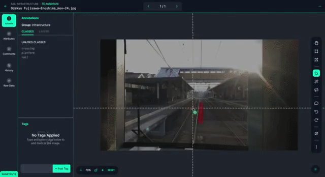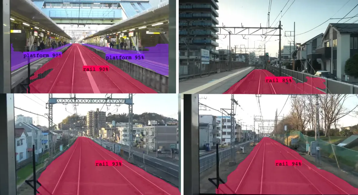Detecting these items quickly is imperative in this use case, so to make processing each frame of the video feed efficient, we’ll create two different types of models. For detecting people and cars, since they occupy a relatively small area of the video feed, the bounding boxes provided by an object detection model is sufficient and will be fast. Since precision is important for making sure where tracks, platforms and crossings are, we’ll create an instance segmentation model (which is usually slower) that detects those railroad infrastructure items.