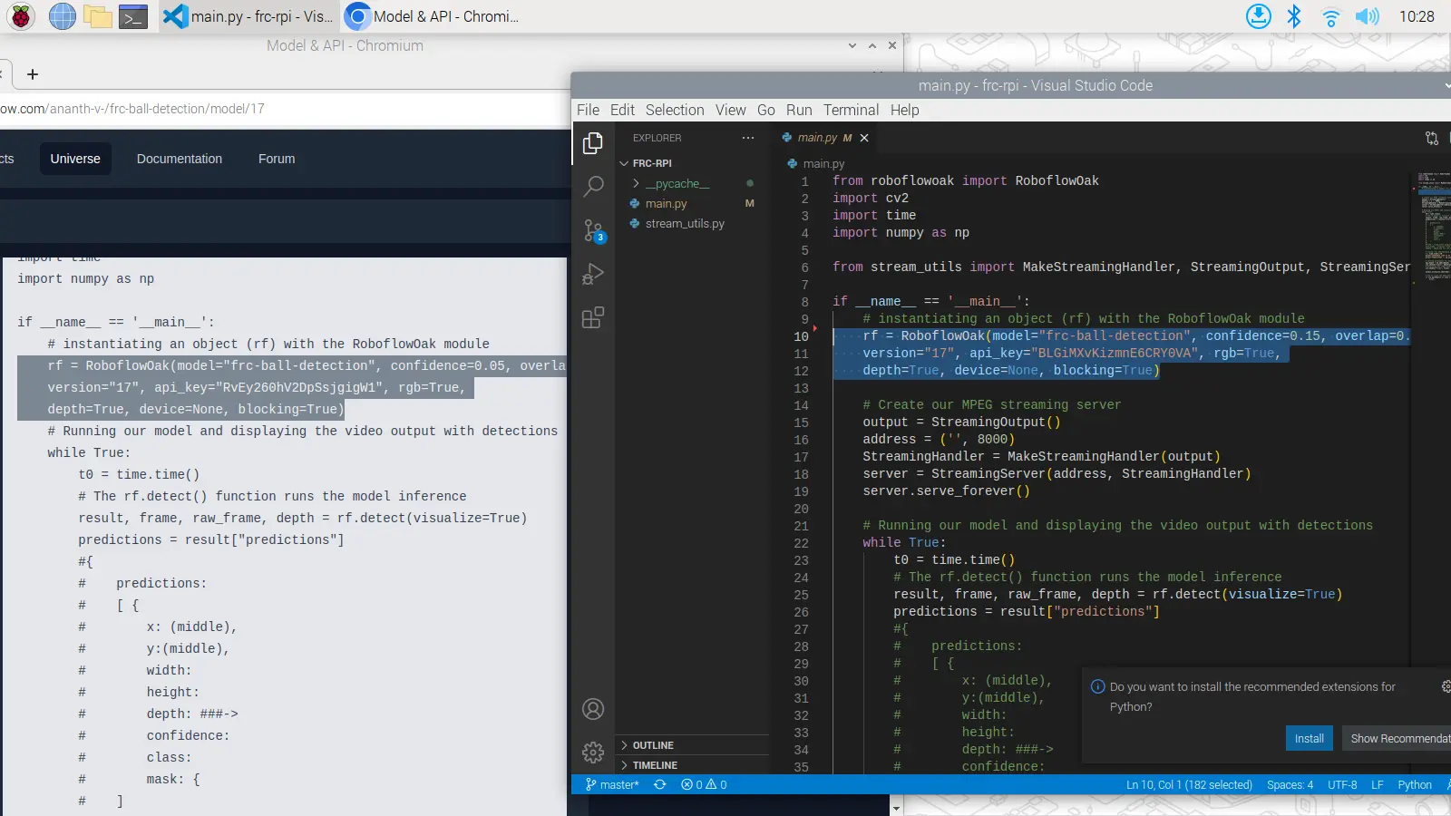And now, open the file main.py in the cloned repository and edit lines 10 through 12 to specify the model and the version you’d like to run, along with your API key. You can find this by clicking the “Luxonis OAK” tab under “Use with” on the model’s test page. We encourage you to experiment with the other deploy options that Roboflow offers as well.