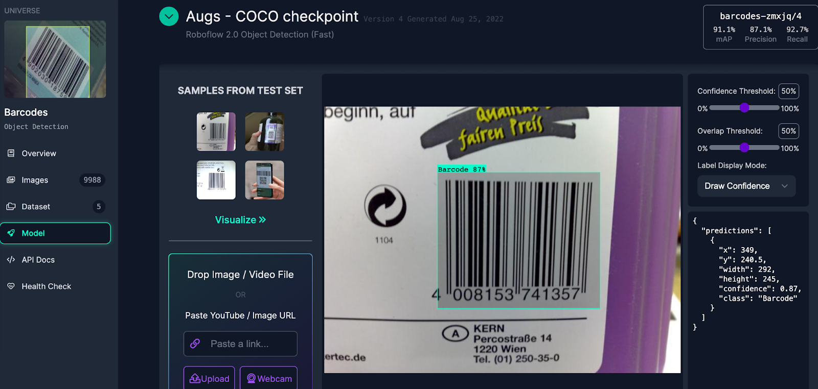Select an image from the “Samples from Test Set” or upload your own barcode to test the API.