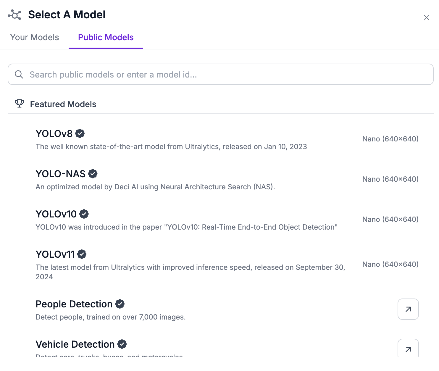 Click "Public Models" and select the YOLOv8 model: