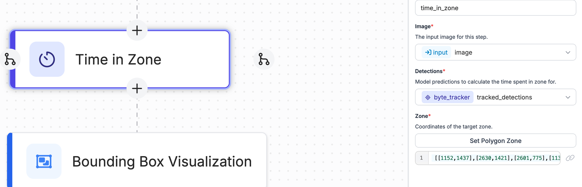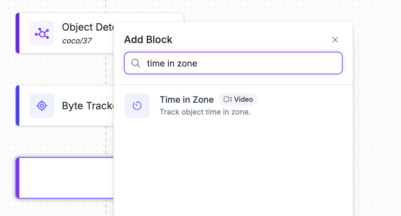 Next, we need to define the "red zone" that we want to monitor. For this, we can use the Time in Zone block. This block tracks for how long an object is in a specified zone.