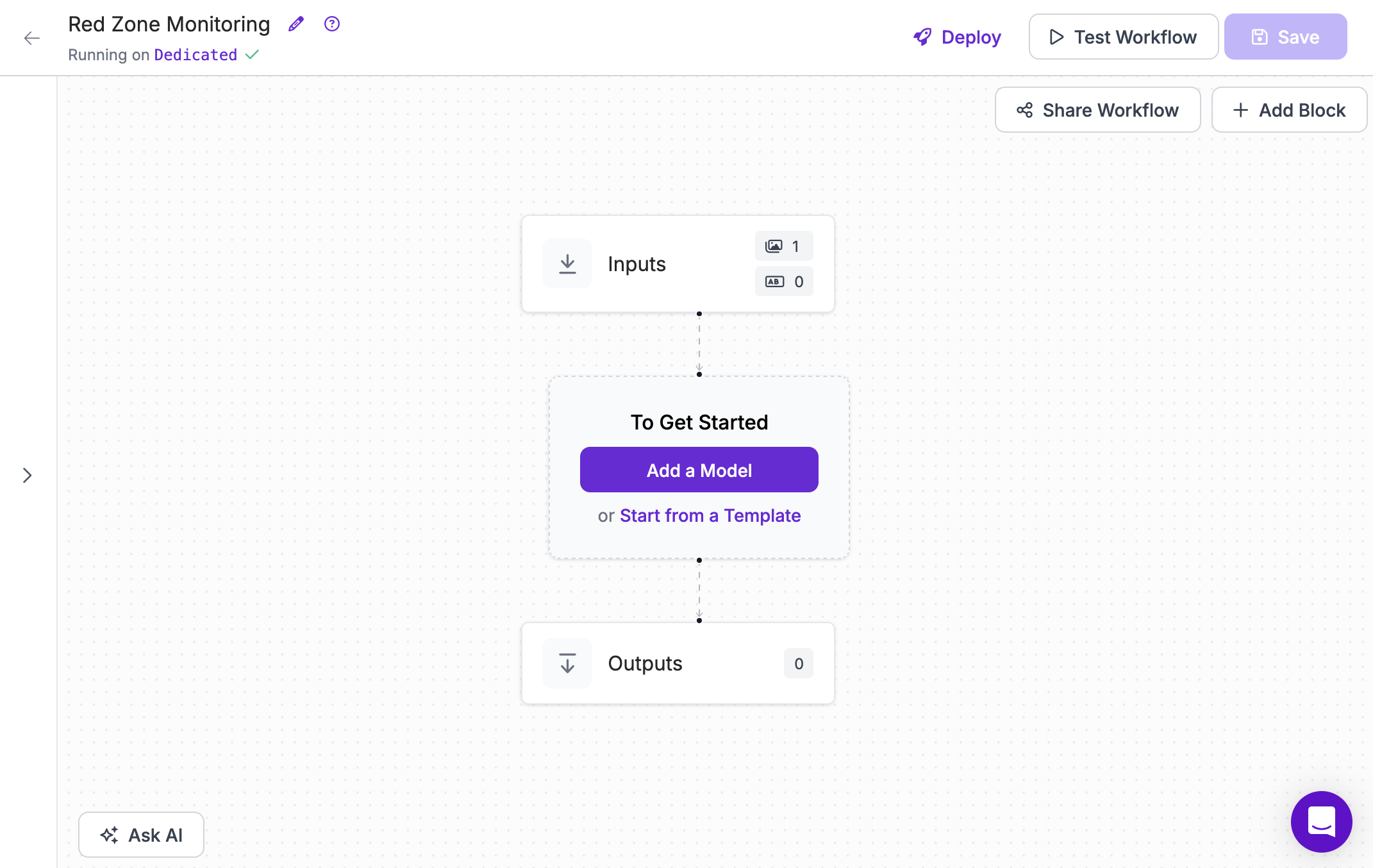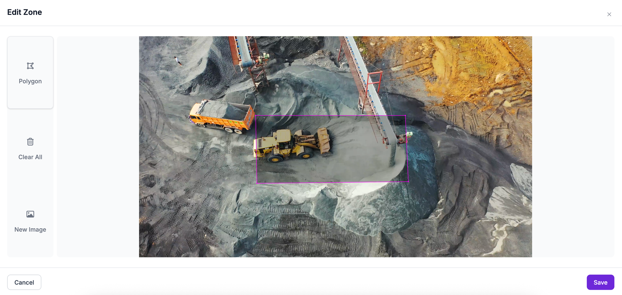 For red zone monitoring to work, your camera should be at a static angle. Upload a frame from your camera feed – or a video, as the Workflows application will automatically take the first frame.
