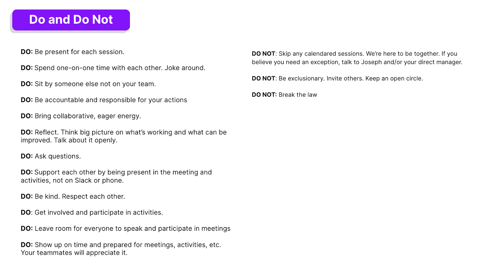 We set up clear expectations and context before the onsite. In addition to sharing a very detailed agenda so people know what we’ll be doing, we also discuss how to interact with one another and why we are doing this onsite.