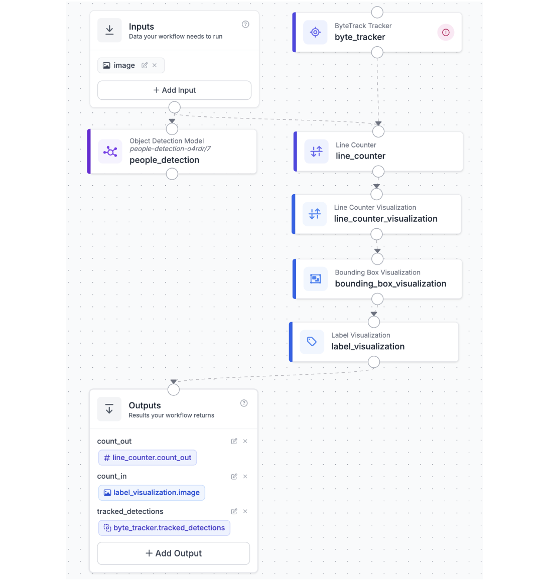 This is where a static detection model becomes a live analytics system. Roboflow Workflows is the connective workflow: it takes each video frame, runs detection, hands the results to ByteTrack, counts crossings at a virtual line, and produces an annotated output showing exactly who is where and where they've been.