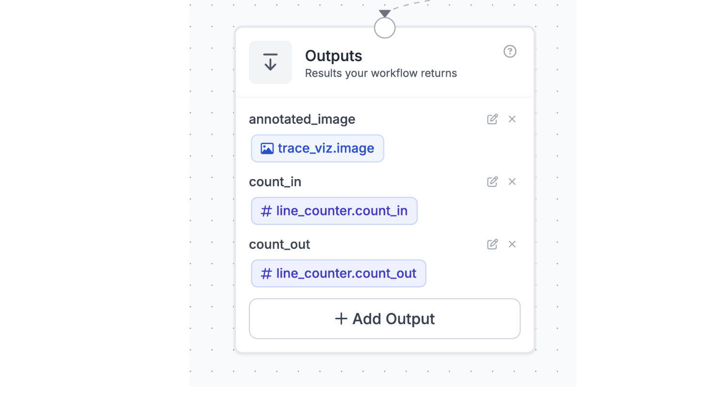 In the Outputs block, route the annotated image from the visualization block so it becomes the workflow’s output. You can also include the raw predictions from the ByteTrack block as a JSON output this gives you the structured per-frame data (bounding boxes, tracker IDs, confidence scores) that you can log for analytics purposes.