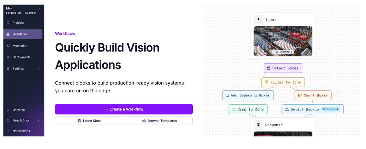 First, create a free Roboflow account. Click “Workflows” in the sidebar of the web application. Then, create a Workflow. You will be taken into the Workflows editor.
