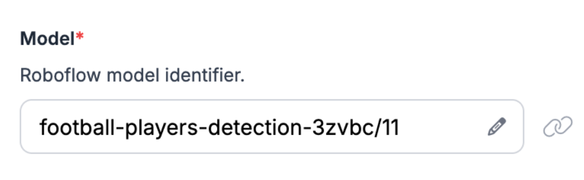 If you already have a detection model trained on or uploaded to Roboflow, specify it here. For this guide, we will use the open football-players-detection-3zvbc/11 model available on Roboflow Universe. This model has been trained to identify players on a football field.