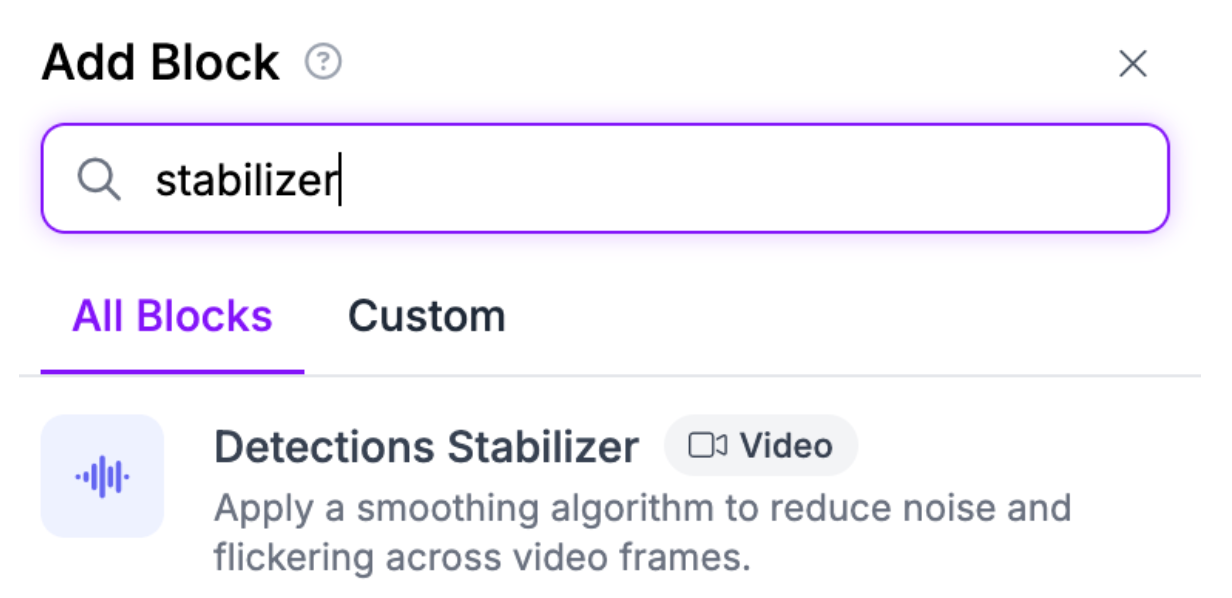 Finally, let’s add a Detections Stabilizer block to help reduce the impact of bounding box jitters in our output data. Bounding box jitters can affect the quality of object tracking, but the stablizer block will help mitigate this issue.