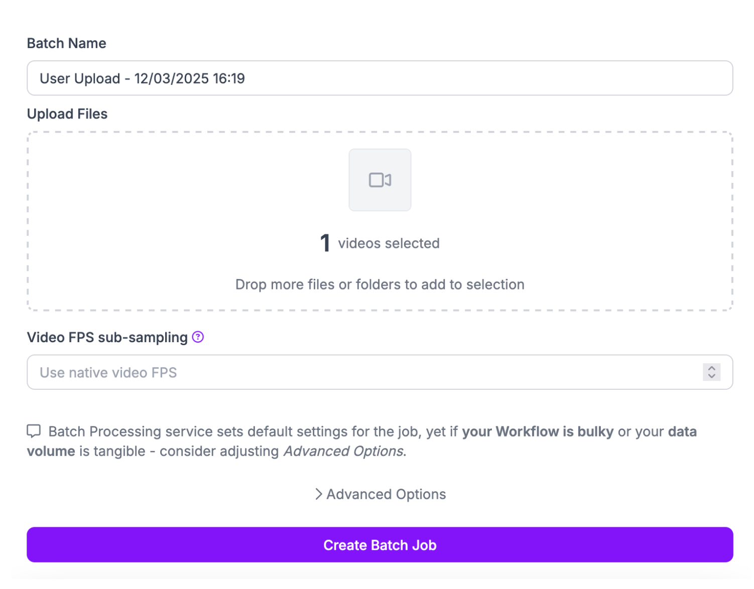 A window will appear in which you can configure your Batch job. First, set a name for your batch. Then, choose whether you want to work with images or videos. For this guide, we’ll work with a 24 FPS video. You can upload multiple videos, too.