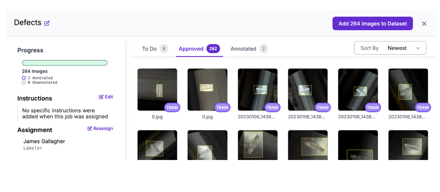 Roboflow Instant models automatically train when you add a batch of annotated images to your dataset. Go to any job in the Annotating column of your dataset, approve annotations that you want to use in your Instant model, then click “Add to Dataset”: