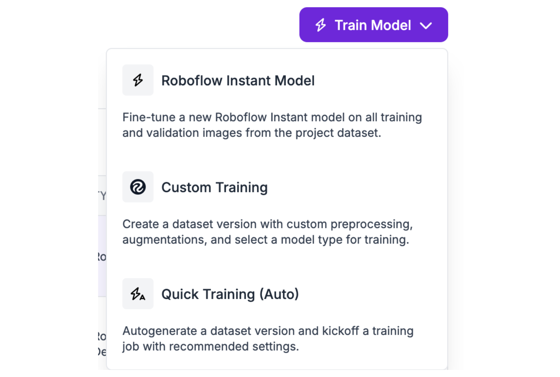 In the dropdown that shows training options, click “Roboflow Instant Model”: