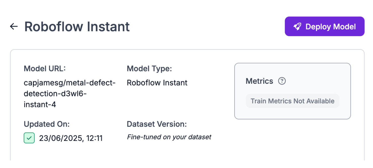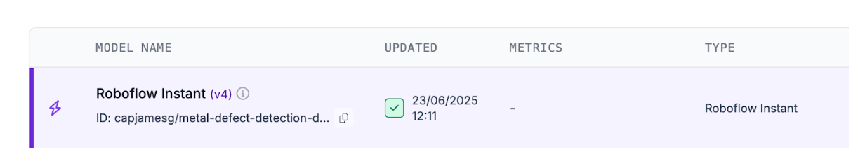 All Instant models trained with your dataset will be listed on your dataset Models page. Here is an example of an Instant model: