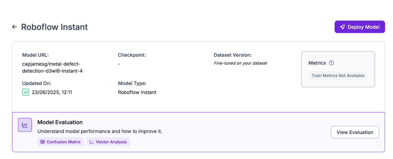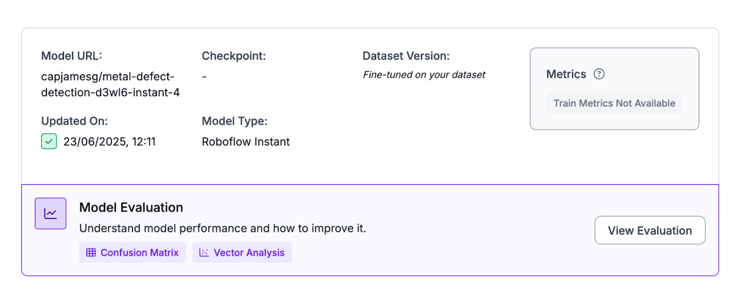 To learn more about model evaluations, refer to the Roboflow model evaluation documentation.