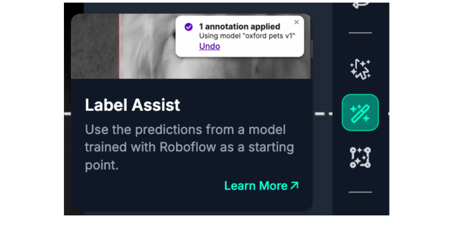 To use an Instant model in Label Assist, open Roboflow Annotate, then click the Label Assist option in the right task tray: