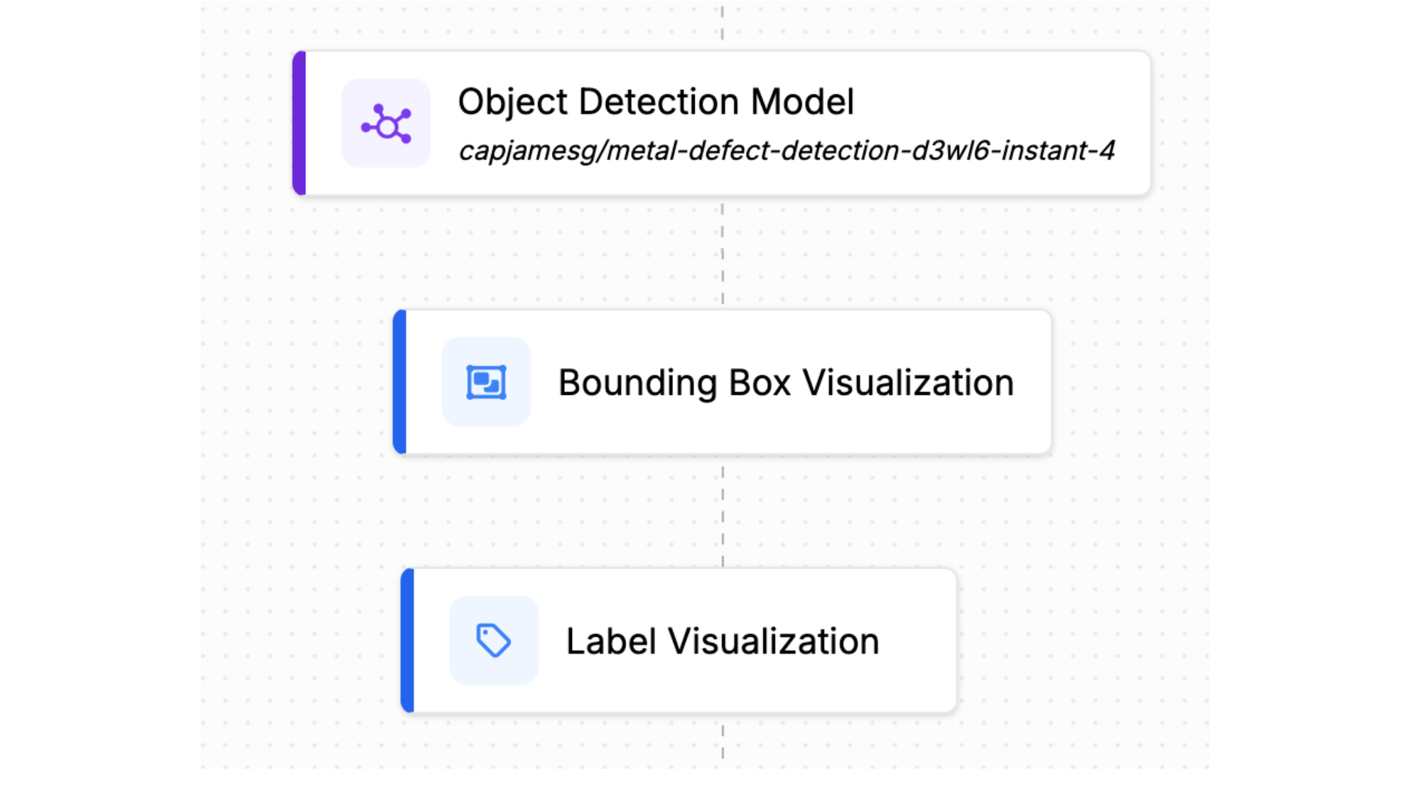By default, this Workflow will only return prediction coordinates from the model. If you want to visualize the results of your Workflow, add the Bounding Box and Label Visualization blocks to your Workflow, like this: