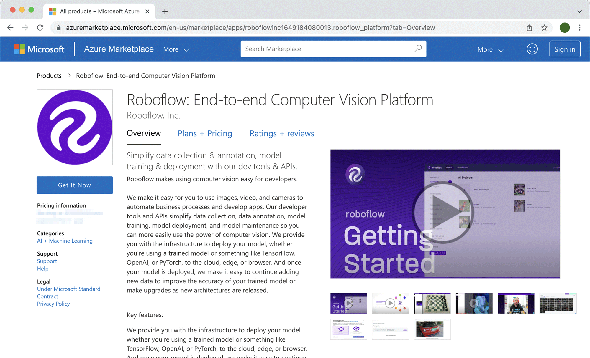 To get started with Roboflow on the Azure marketplace, go to the Roboflow listing in the Azure Marketplace, review our plans and pricing, click “Get it now”, and subscribe today.